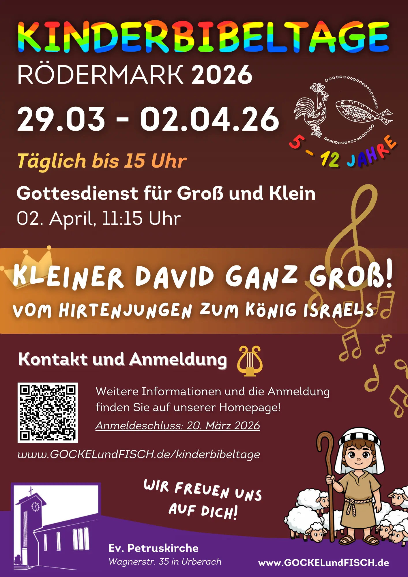 Unter dem Motto „Kleiner David ganz groß! - Vom Hirtenjungen zum König Israels" versammeln sich von Sonntag bis Donnerstag in der Woche vor Ostern Kinder aller Konfessionen unter dem Dach der Evangelischen Kirchengemeinde Rödermark in Urberach, um miteinander zu spielen, zu basteln und zu singen. Beim gemeinsamen Morgeneinstieg in der Kirche gibt es ein tolles Theater und Musik von der KiBiWo-Band. Danach erleben die Kinder ein buntes Programm in kleinen Bezugsgruppen. Mittags wird es ein einfaches warmes Essen geben.